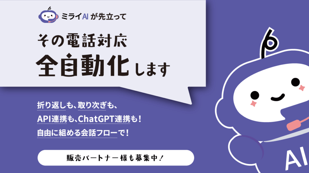AI電話自動対応サービス「ミライAI」。通話の文字起こし、取り次ぎ、よくある質問への回答まで自動対応。パートナー企業募集中です。