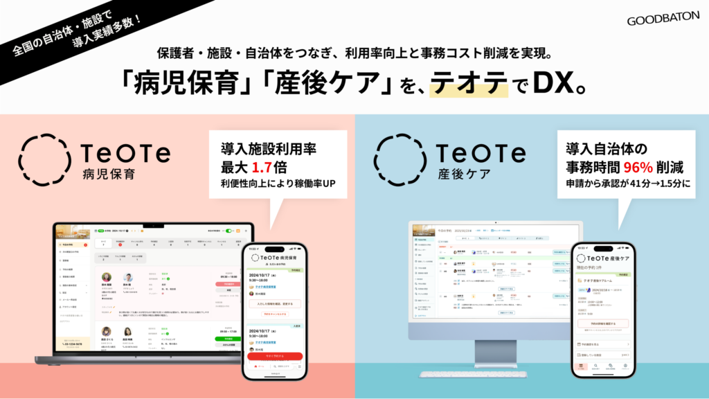 病児保育・産後ケア施設の空き可視化&予約サービス「テオテ」。保護者・施設・自治体をつなぐ子育て支援DXプラットフォーム