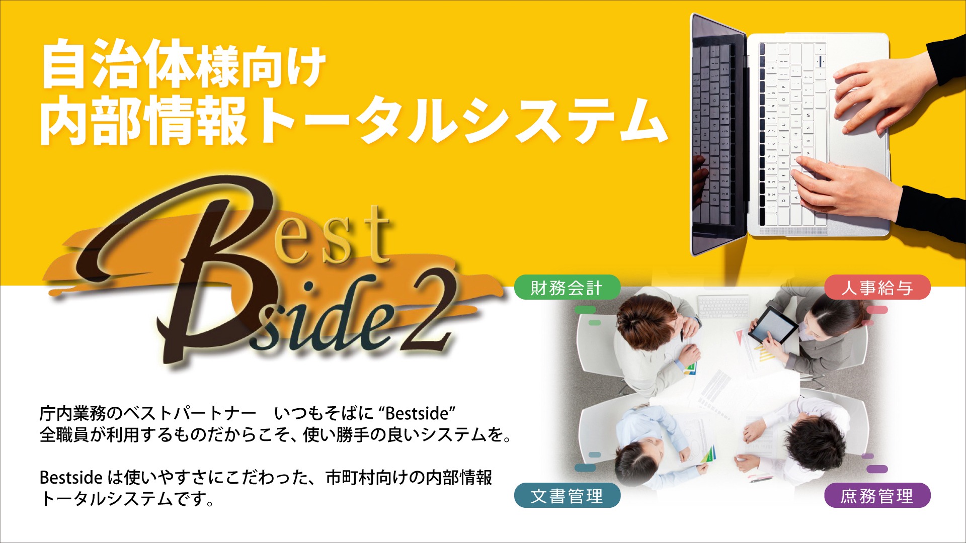 自治体様向け内部情報系トータルシステムBestsideの展示と、自治体様向けITインフラ基盤構築事例等をご紹介しております。