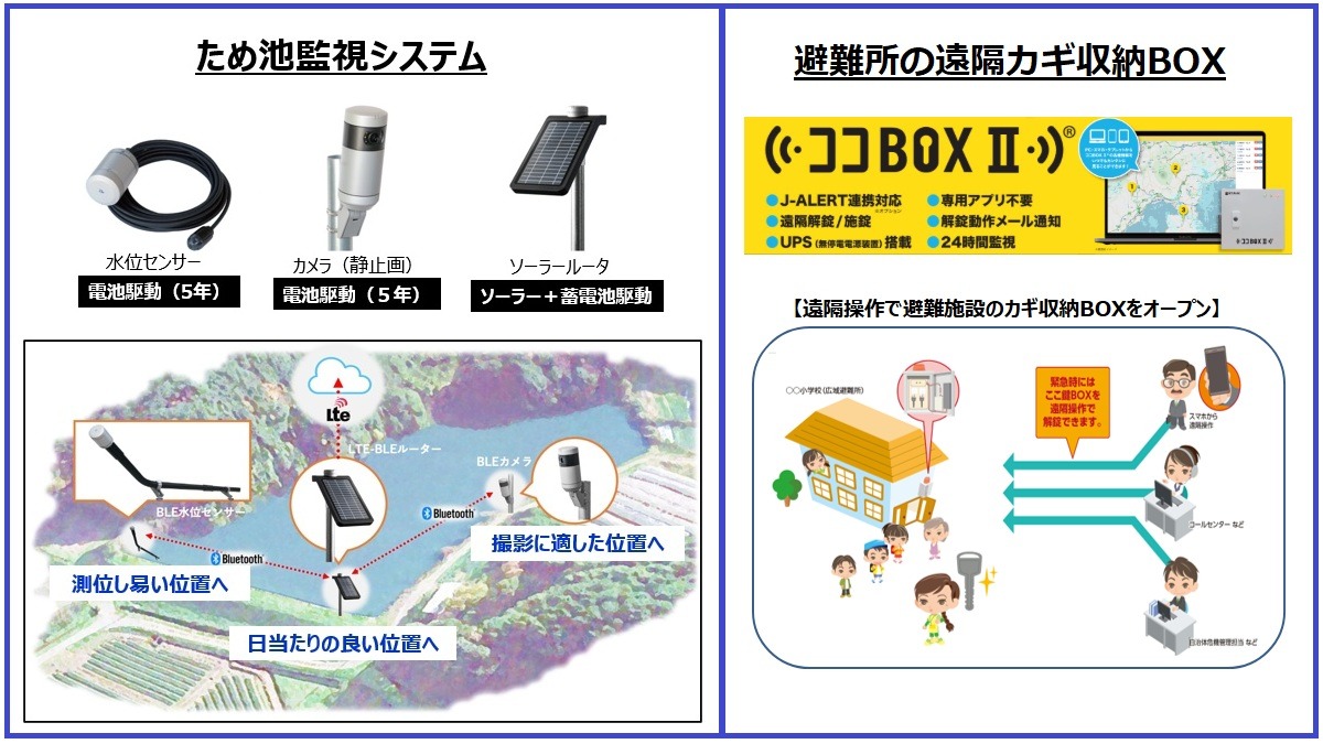 自治体様で多数採用実績がある「ため池監視システム」や「避難施設の遠隔カギ収納BOX」等の防災対策ソリューションを展示しております。